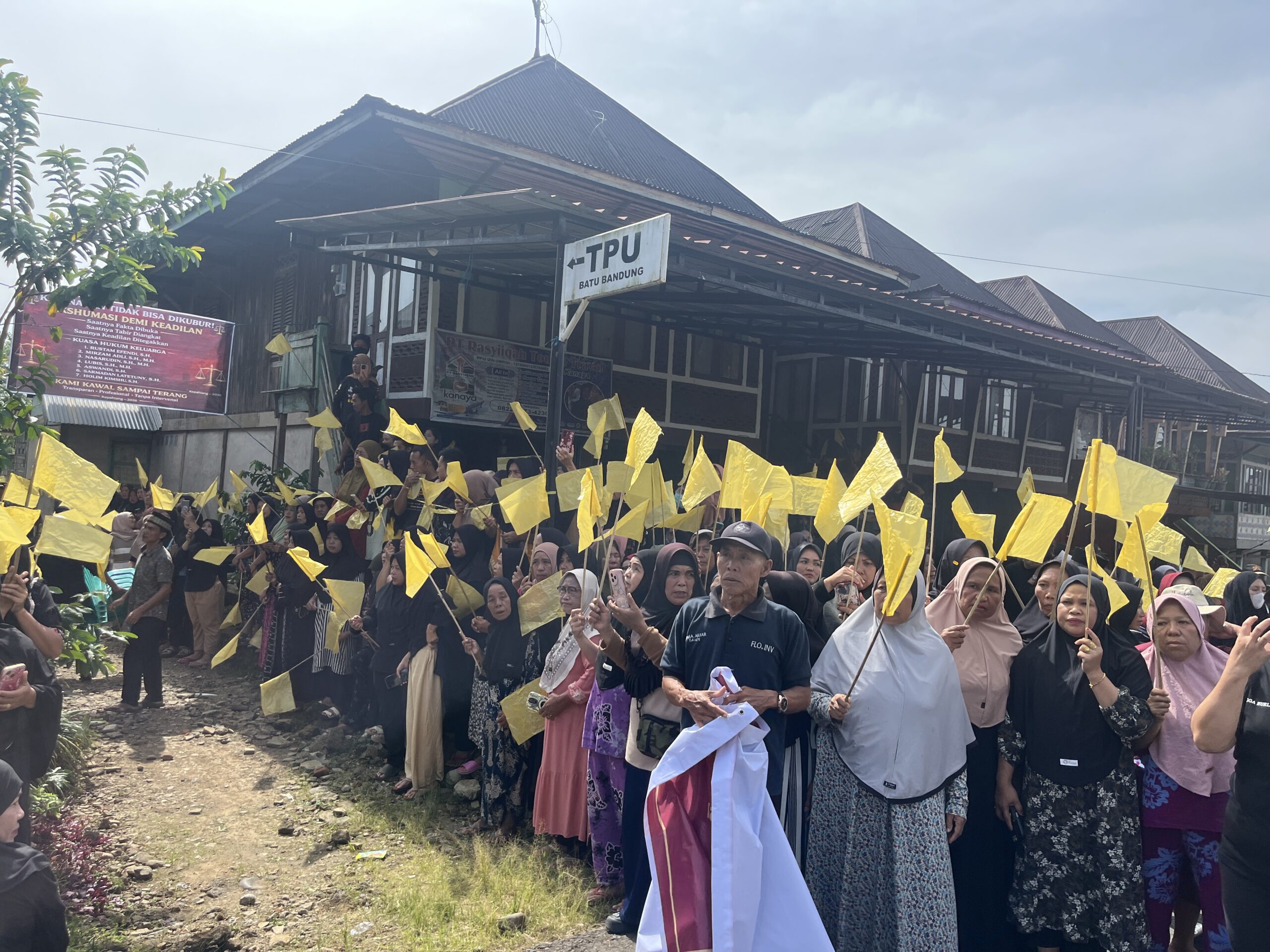 Pantauan di lapangan, ratusan warga tampak berjejer di sepanjang jalan hingga simpang gang menuju area pemakaman. Bendera kuning berkibar di tangan warga, menciptakan pemandangan haru yang mencerminkan kepedulian mendalam terhadap keluarga almarhumah.