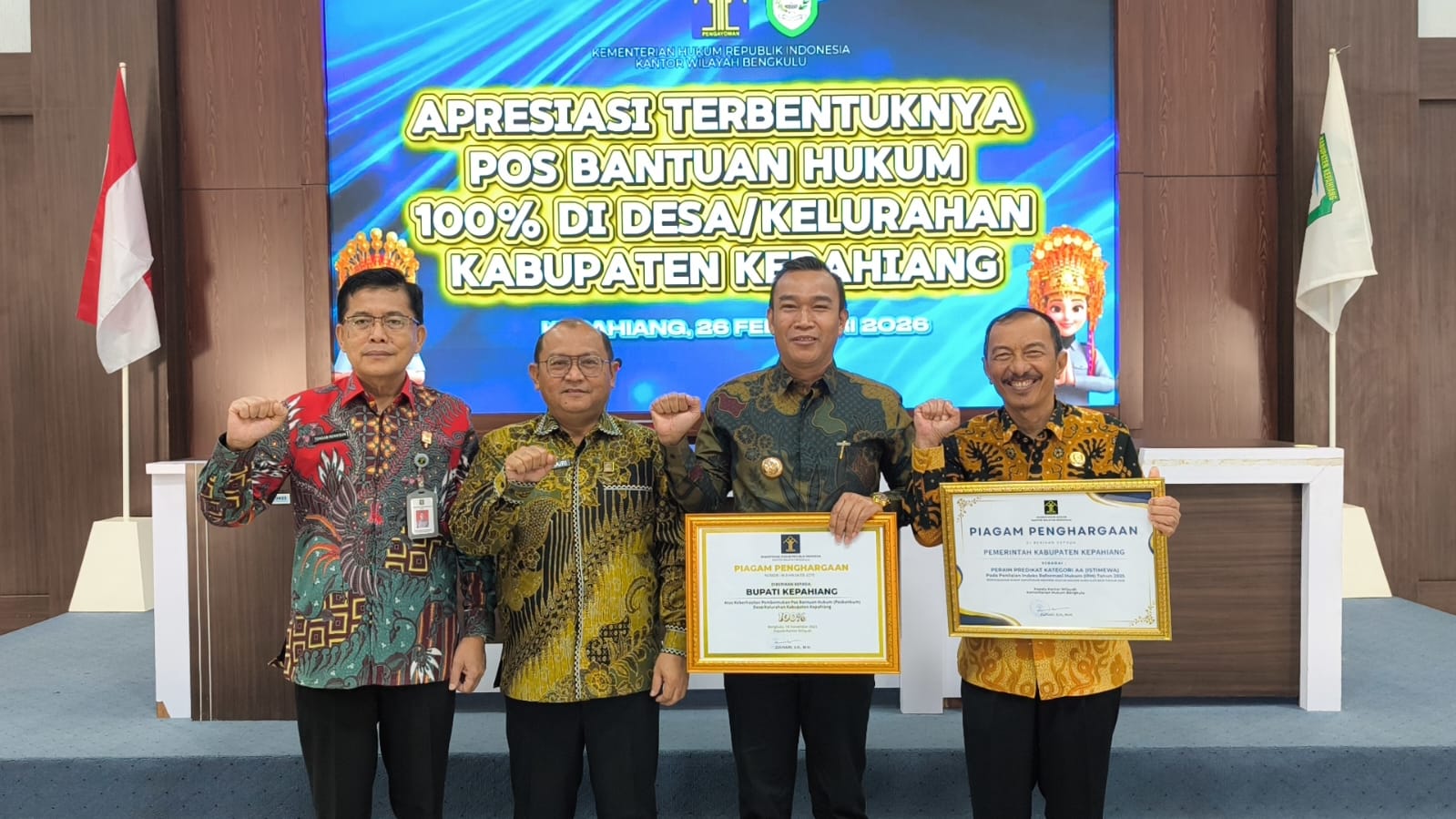 Pemerintah daerah kabupaten Kepahiang mendapatkan 2 piagam penghargaan sekaligus dari Kementerian Hukum Republik Indonesia kantor wilayah Bengkulu. 2 capaian tersebut adalah terbentuknya 100% Pos Bantuan Hukum Kelurahan dan Desa Se-kabupaten Kepahiang dan Indeks Reformasi Hukum dengan predikat AA (Istimewa).